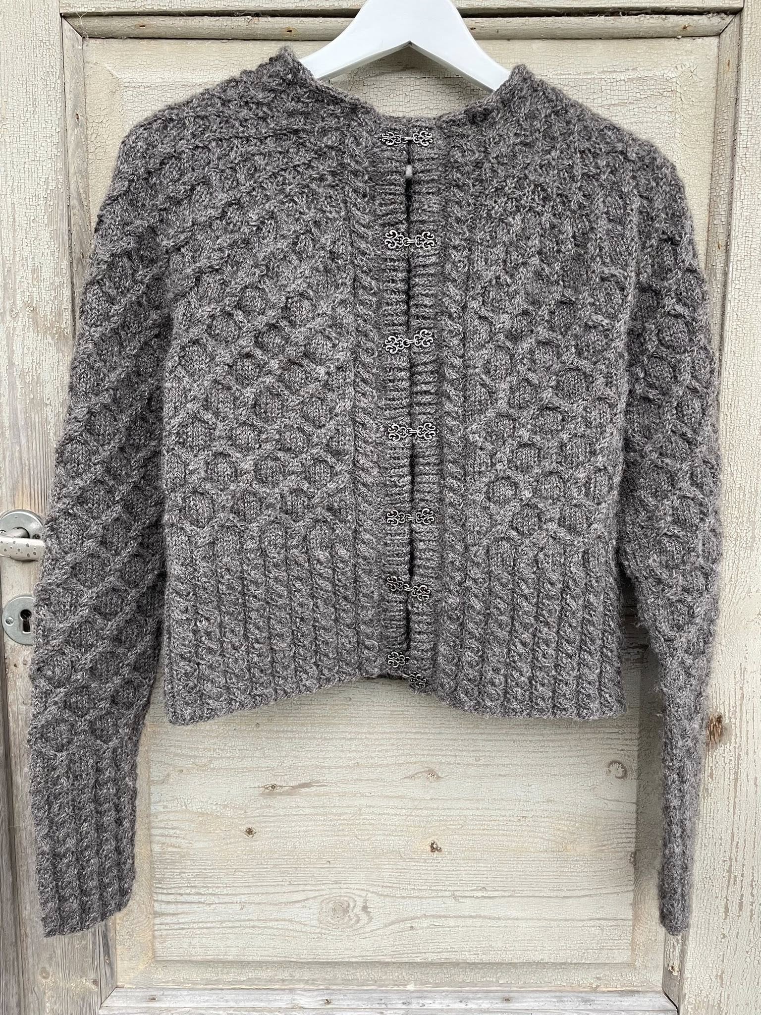 Cable knit reduces the circumference of the jacket and stretches, so please take this into account when choosing a size. The measurements given are approximate, as cable knit is denser than stockinette knit. The sleeve and body lengths can be knitted as needed, example measurements in the pattern.